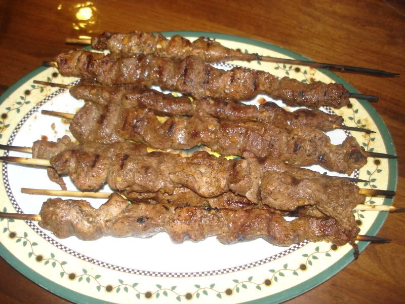 3. Remove meat from marinade and drain, but do not pay dry. Place skewers into meat and grill to desired doneness over a well-oiled, medium-hot grill. For medium-rare, cooking time is approximately 3 – 4 minutes (I did mine 5-6 more medium than medium rare still tender and juicy).
